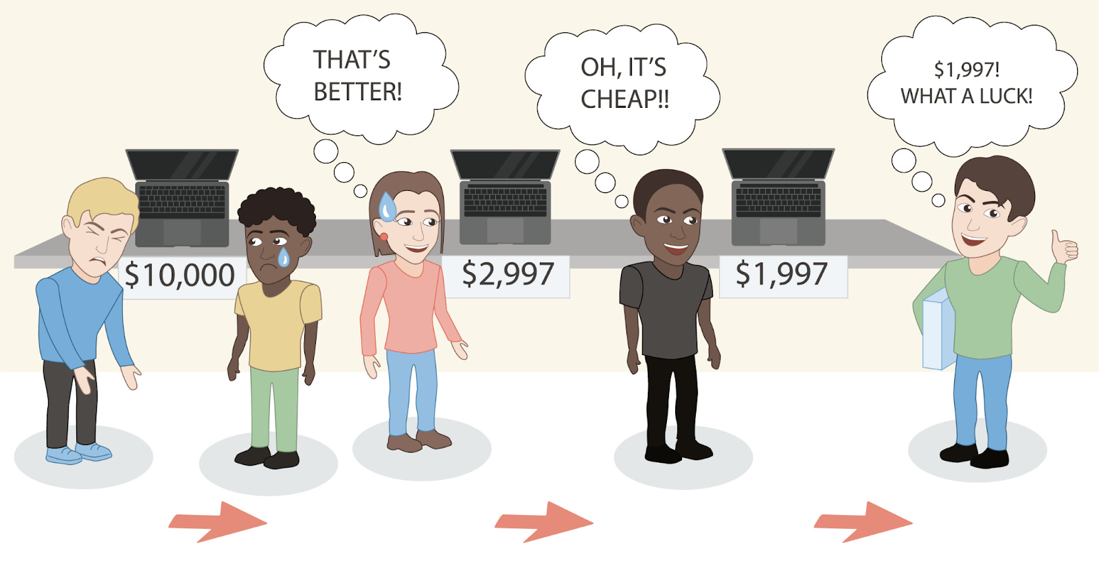 Coffee sizes (e.g., Starbucks): Starbucks offers coffee in three sizes (Tall, Grande, Venti). The Grande size, being the middle option, is often the most selected by customers because it is perceived as the most reasonable amount—not too small, not overly large.