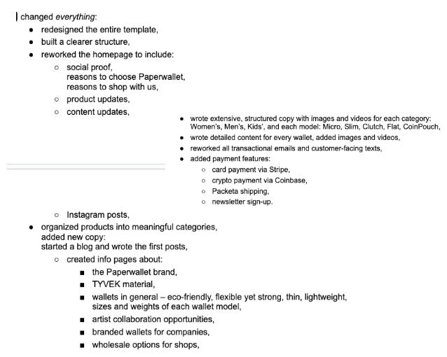 There was no basic information about the wallets in general, or the material they were made of. I had access to photos and videos from the HQ for every wallet, but they were missing from the product pages. I added detailed descriptions with features, parameters, and info about who Paperwallets are suitable for.