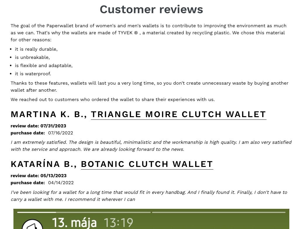 “I knew setting up the limited company would take some time, so I got to work. In emails and social media messages, I found a few contacts worth reviving. One satisfied customer sent me a photo of their wallet after five years of use (I added it to the references), and I arranged a promo post for launch day with travel influencer Dominika, IG @cestujspoznavaj.”